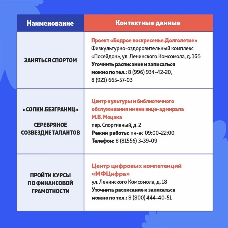 Проект предлагает бесплатные спортивные занятия в «СОПКАХ. СПОРТ» и бассейнах в муниципалитетах региона, организацию культурных мероприятий, развитие серебряного волонтерства и запуск проекта «СОПКИ.БЕЗГРАНИЦ», реализацию мер по повышению финансовой и цифровой грамотности населения.