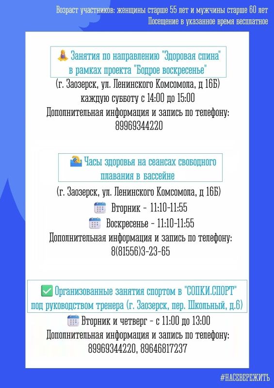 В рамках губернаторского проекта "Северное долголетие" в ЗАТО город Заозерск созданы условия для активной и насыщенной жизни людей старшего возраста в сфере культуры и спорта.