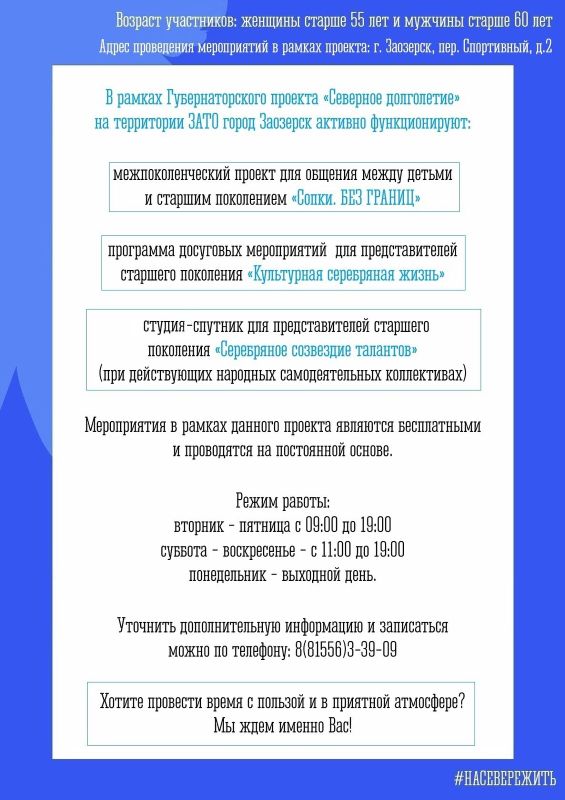 ЦКБО ЗАТО город Заозерск ежемесячно организует досуговые мероприятия для людей элегантного возраста. Уточнить подробную информацию и записаться на мерпориятия можно по телефону: 8(81556)3-39-09.